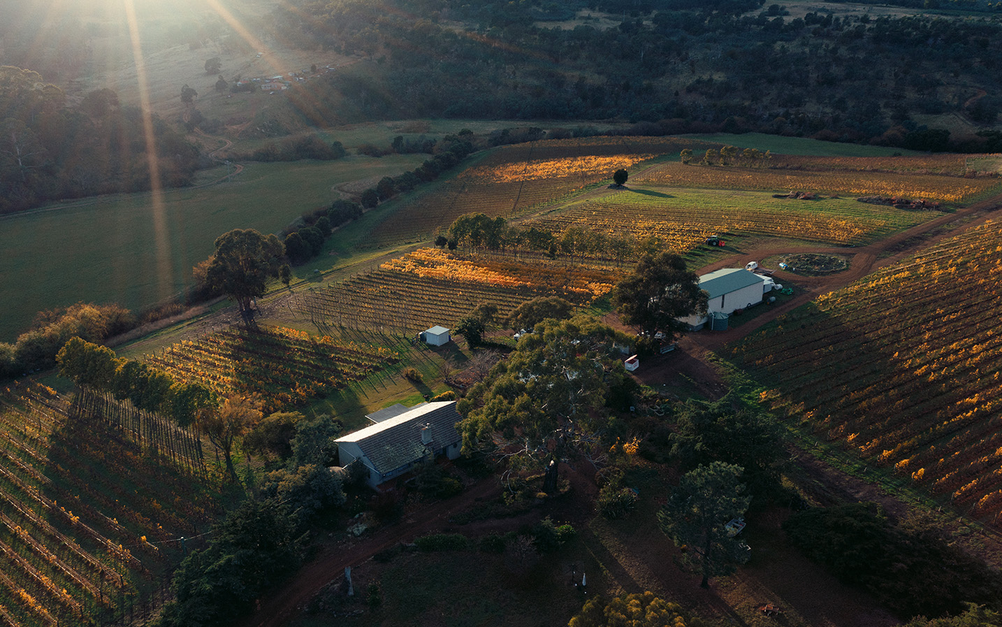Butchers Hill Vineyard is a prominent feature of the Richmond landscape as it protrudes from its borders. This site’s steep north-facing slope means that it receives some very long sunlight hours, protection from cold southern winds, and increased soil drainage. The iron oxide deposits in our soils allows for heat and water to be held longer as they are darker and more clay based. These soil attributes also interact with the production of flavonoids in the fruit which typically produces complex robust wines.